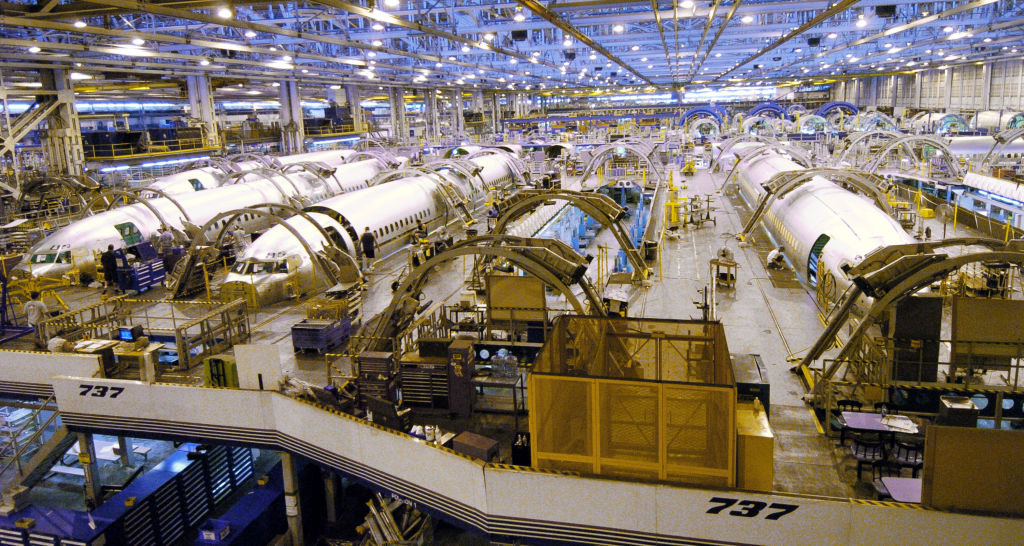 Fuselagens de aviões 737-800 em produção na fábrica da Boeing em Wichita, Kansas, em 2004 (Foto: Larry W. Smith/Getty Images)